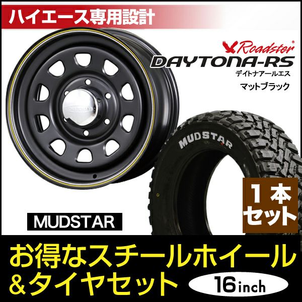 Roadster|200系ハイエース/レジアスエース1~6型用 Daytona-RS 16インチ×6.5J+38 6穴 マットブラック+MUDSTAR RADIAL M/T 215/65R16C 109/107R ホワイトレター